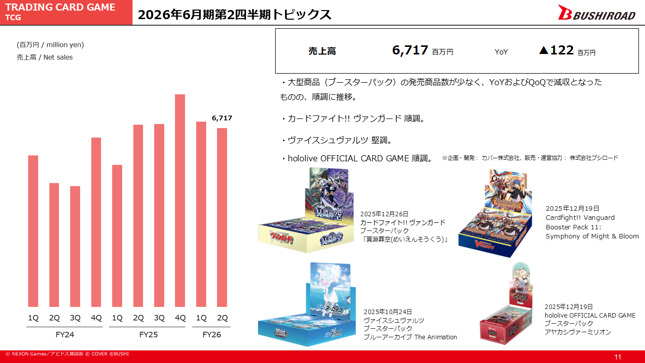A2:昨年(2025年)の夏くらいから、ブシロードのTCGが少し軟調な兆しがあるなと感じており、10月以降、秋くらいから改善策を講じてまいりました。