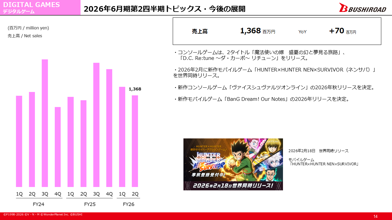 続いて、デジタルゲームは、売上高 13億6,800万円、前年同期比 プラス 7,000万円となりました。