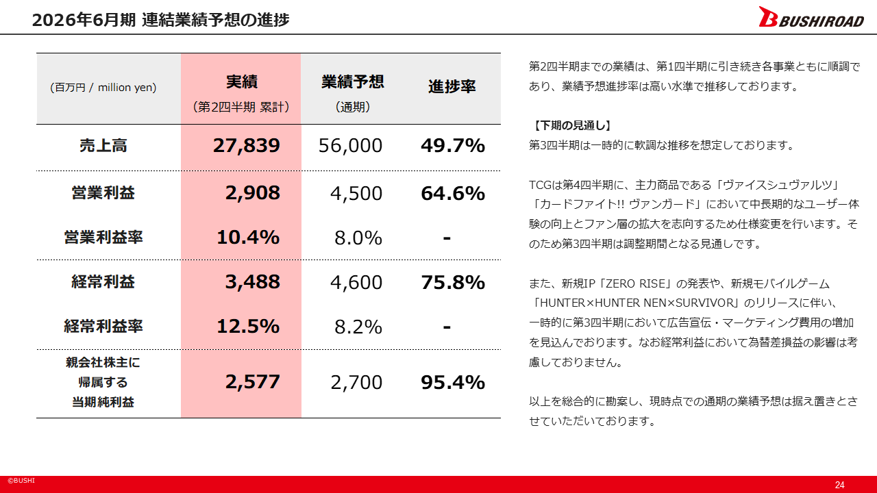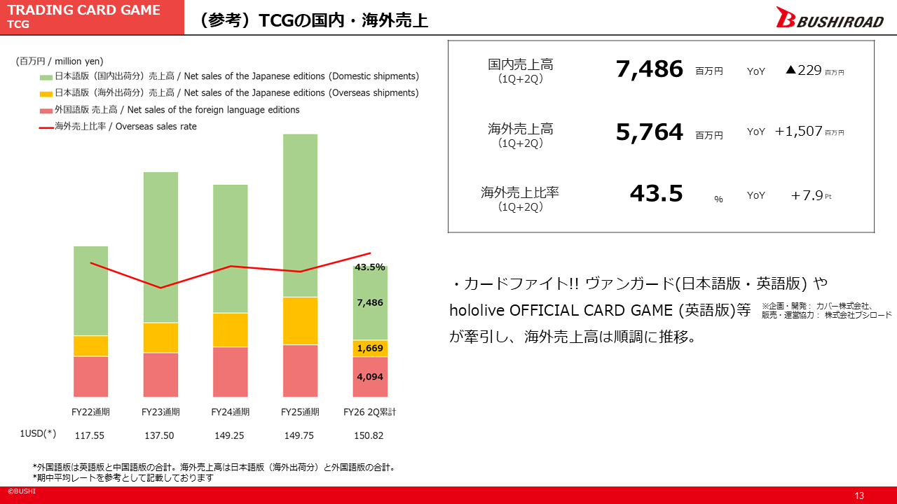カードファイト!! ヴァンガードや、hololive OFFICIAL CARD GAME(企画・開発: カバー株式会社、販売・運営協力 : 株式会社ブシロード)などが牽引し、海外売上比率が43.5%と順調に推移しました。