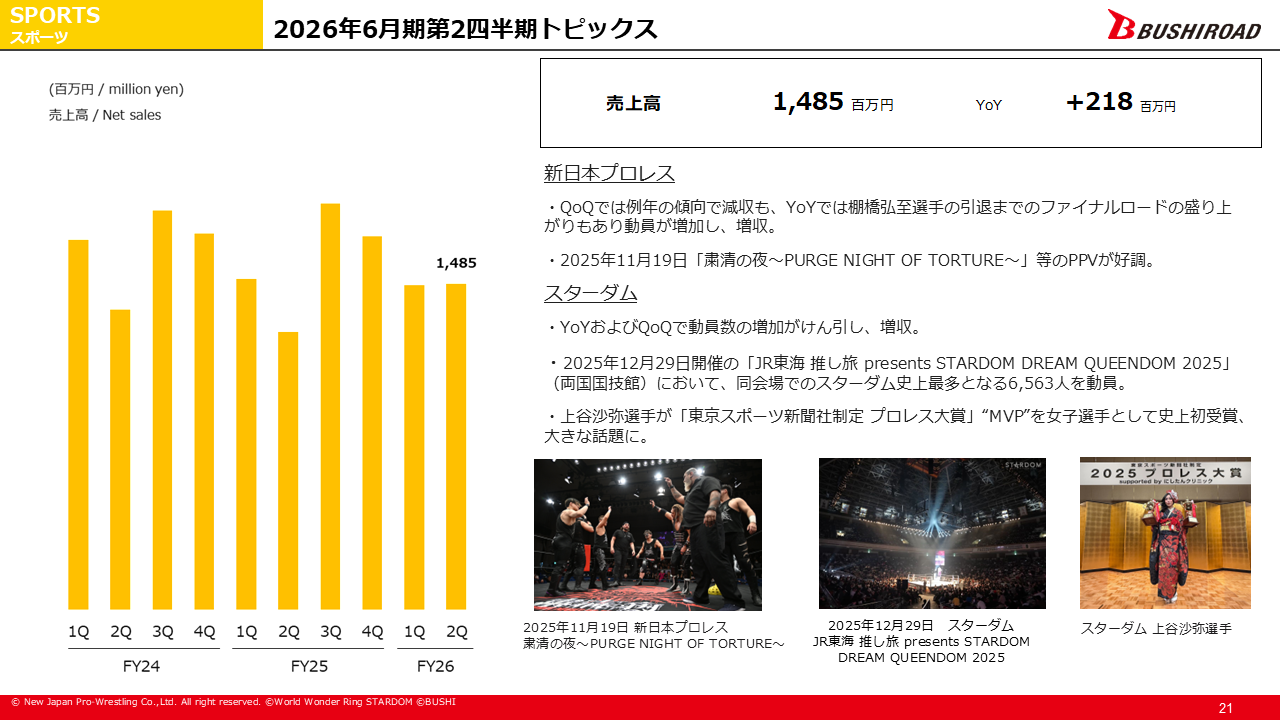 スターダムでは、12月29日の両国国技館大会において、史上最多となる6,563人を動員するなど観客数の伸びが牽引し、増収を達成いたしました。