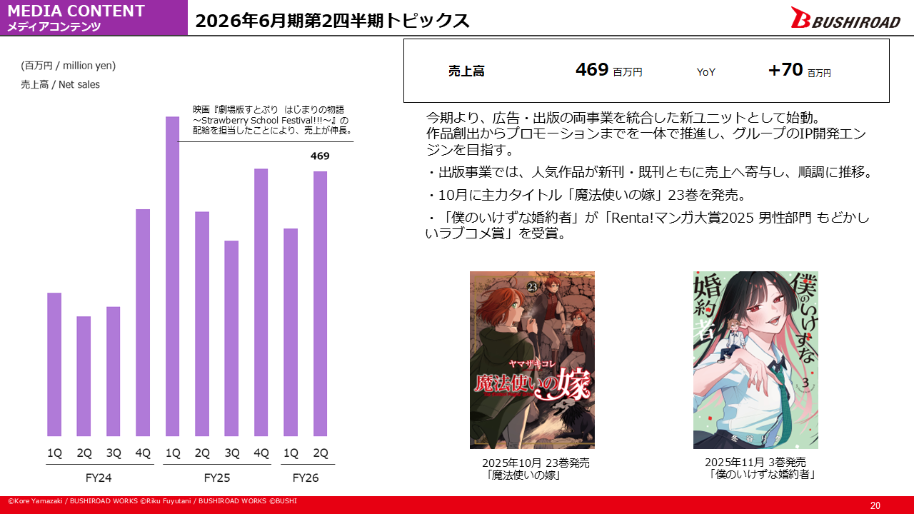 出版事業では、10月発売の主力タイトル『魔法使いの嫁』23巻をはじめ、人気作品が新刊・既刊ともに売上に寄与し、順調に推移いたしました。