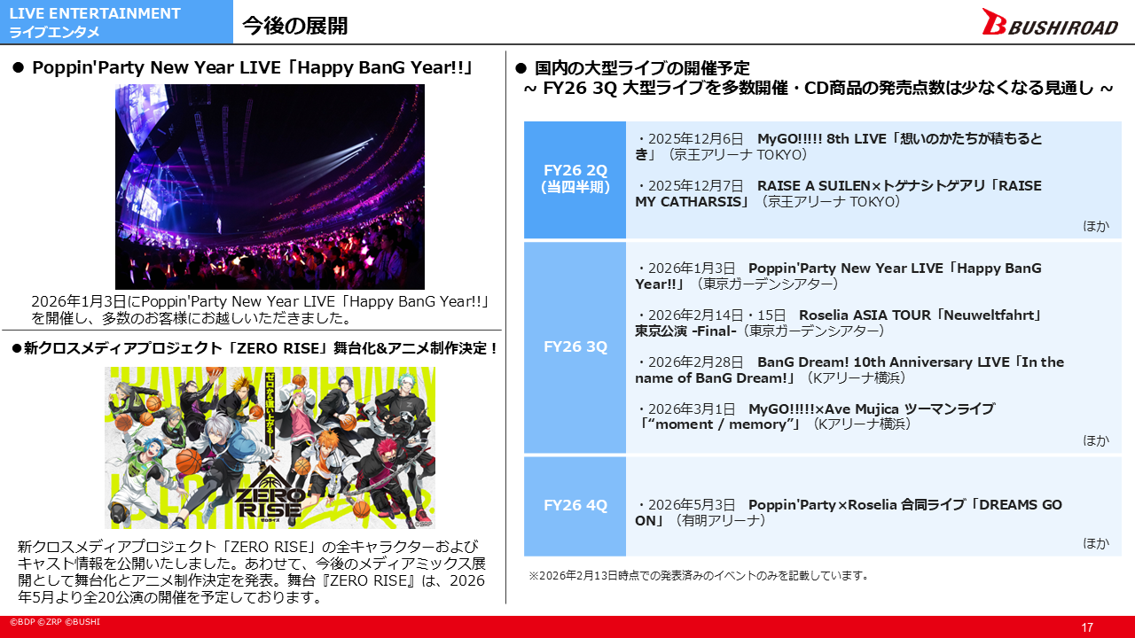 また、新作コンソールゲーム「ヴァイスシュヴァルツオンライン」、新作モバイルゲーム「BanG Dream! Our Notes」については、ともに2026年内のリリースを予定しております。